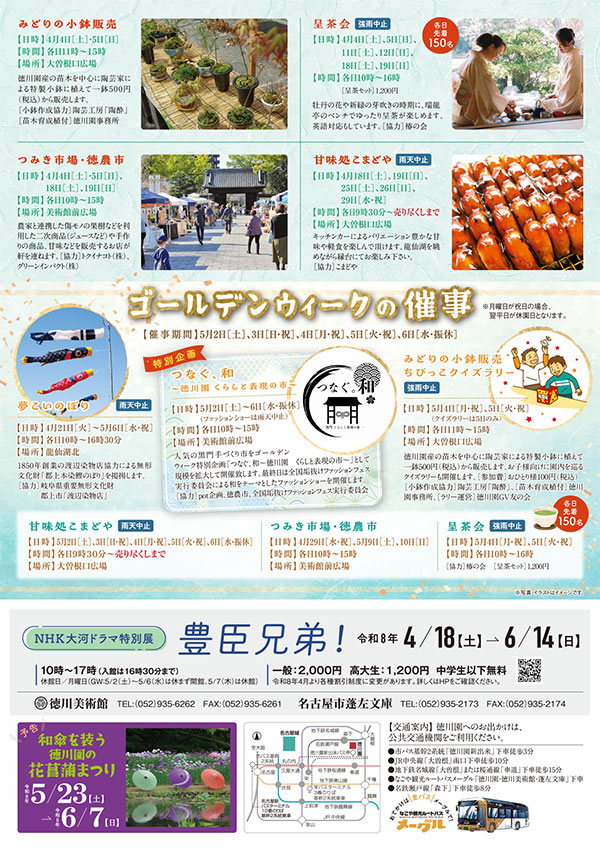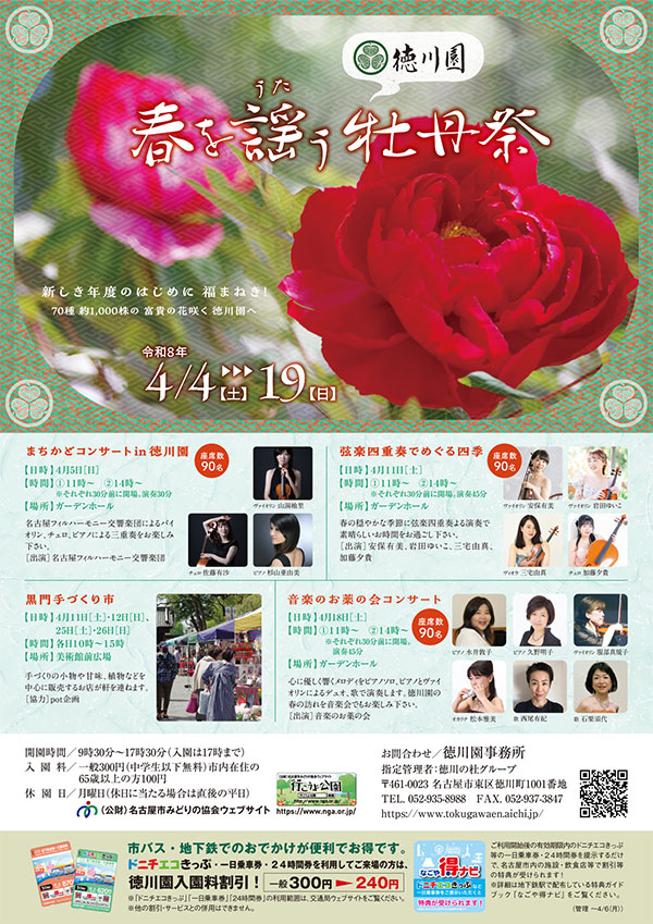 徳川園では、70種、約1,000株の花の王・牡丹が咲き誇る時期に「春を謡う 徳川園牡丹祭」を開催し、各種催事と共に皆さまをお迎えします。新緑が薫るゴールデンウィークもお勧めです。